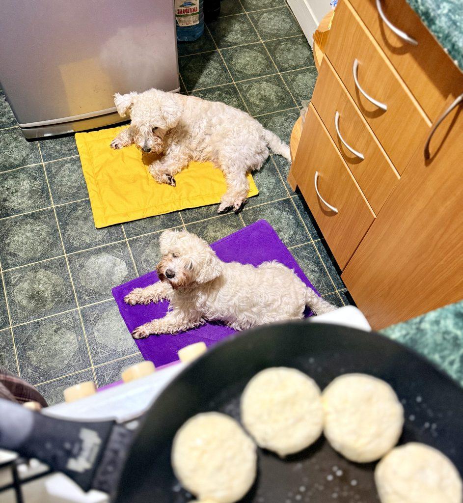 - я готую їжу або займаюся хатніми справами — собаки лежать на килимках поруч;